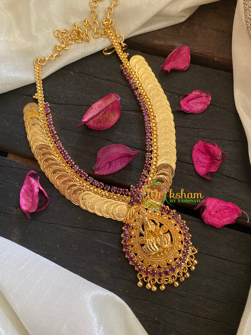 Gold Lakshmi Kaasumala Neckpiece with Lakshmi Pendant-Red; Red AD Stone Studded pendant- Traditional Kerala jewelry; NECKPIECE ONLY