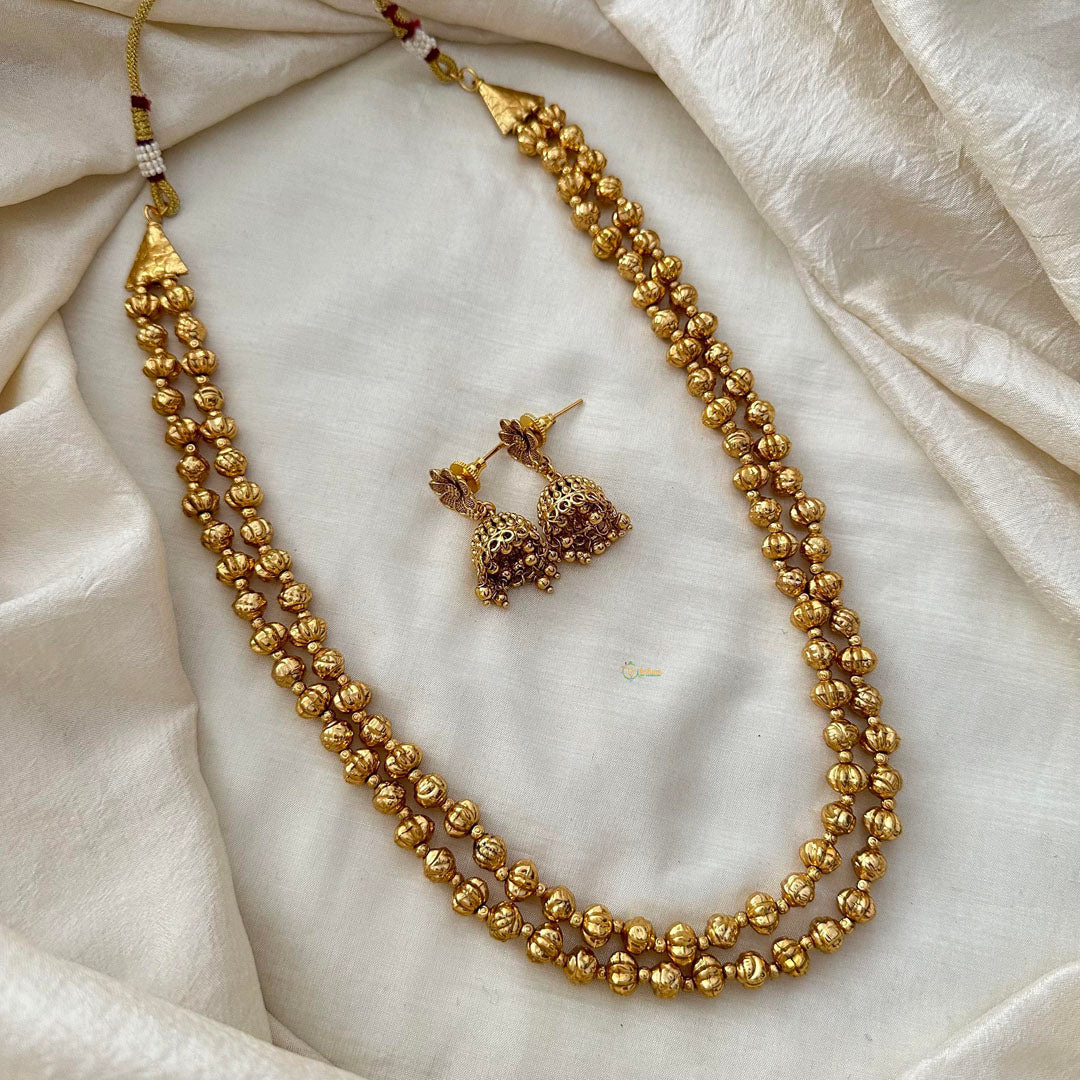 Elevate your style with our Gold Layered Beaded Malai. This exquisite piece features two layers of delicate gold beads, adorned with matching jhumkas for a complete look. Perfect for any occasion, this luxurious malai is sure to make a statement and add a touch of sophistication to any outfit.