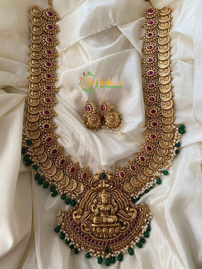 Gold Look alike Long Coin Lakshmi Haram is a gold look alike neckpiece and comes with earrings; Red stone studded green bead and pearl finish.