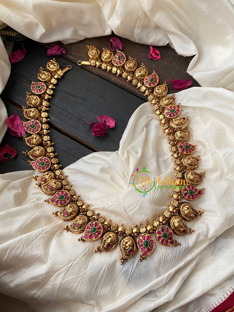 Gold Look Alike Precious Kemp Maanga Maalai Haram– One gram gold polish -Hand moulded -closed back neckpiece– complete paisley pattern - studded with semi-precious real kemp stones with no pendant. NECKPIECE ONLY.