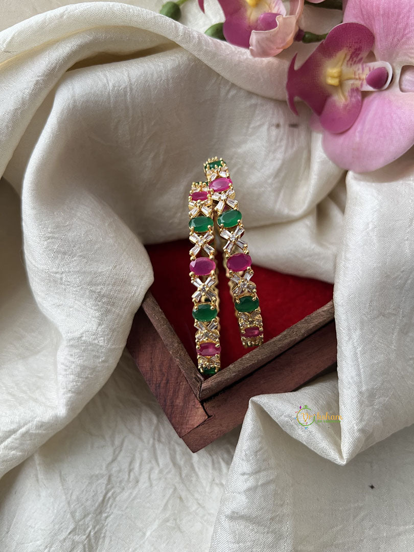 Gold Look Alike AD Stone Bangle Set -White Green Red -Geometric - AD Stone studded festive bangles , Comes as pair only.