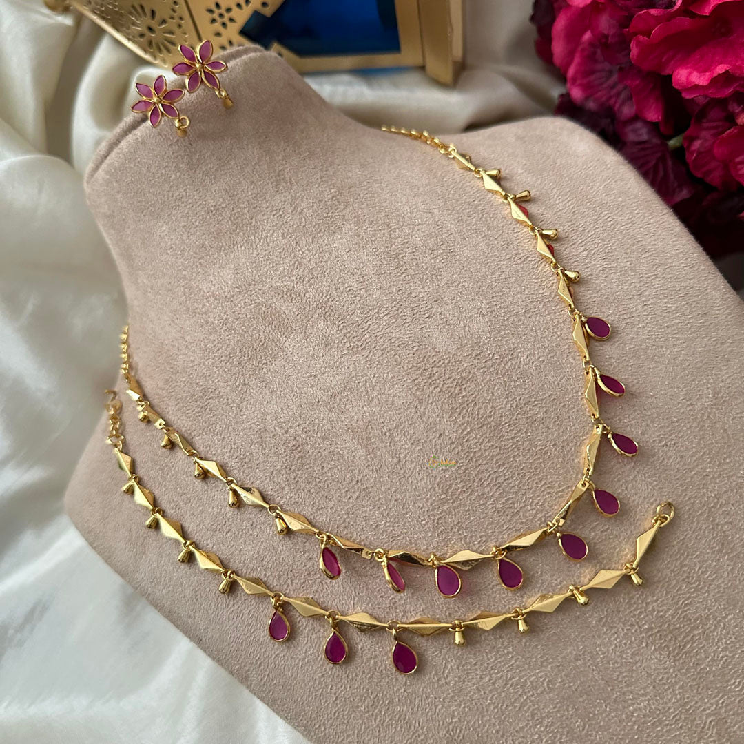 Elevate your style with our AD Stone Pendant Chain, matching earrings and, bracelet. Perfect for any occasion, this set adds a touch of elegance and sophistication. Shine bright with the sparkling stones and complete your look with this beautiful and versatile accessory.
