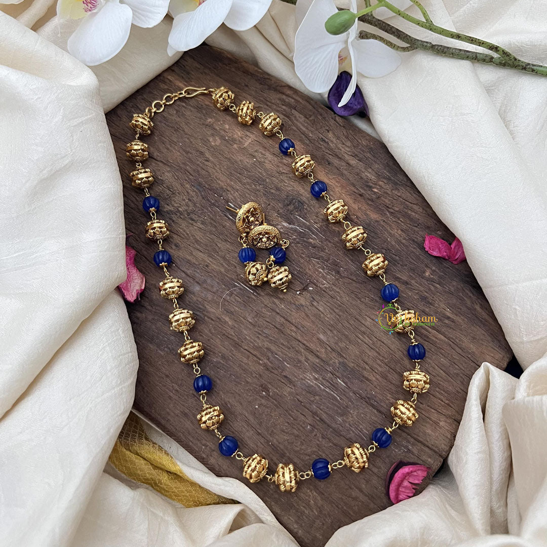 Indulge in luxury with our Gold Look Alike Beaded Mala in Blue. This stunning piece is adorned with intricate gold beads and comes with matching earrings. Elevate your style with this exclusive accessory that adds a touch of sophistication to any outfit.