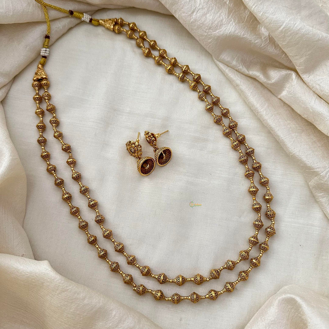 Indulge in luxury with our Gold Look Alike Beaded Malai, featuring two layers for an elegantly layered look. The intricate beadwork adds a touch of opulence to any outfit. Complete the ensemble with matching earrings for a truly exclusive and timeless appeal.