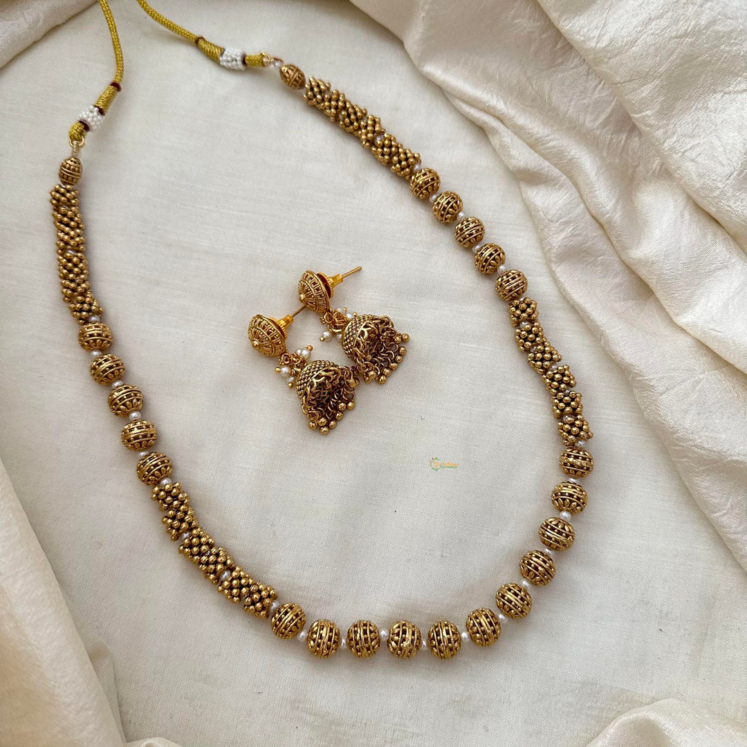 Elevate your look with our Gold Look Alike Beaded Malai-Pearl-G13377. Crafted with intricate golden beads and luxurious pearls, this malai exudes elegance and glamour. Perfect for any occasion, add a touch of sophistication to your wardrobe and make a statement with this stunning piece. Comes with matching jhumkas.