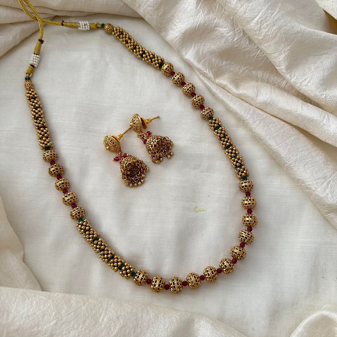 Elevate your look with our Gold Look Alike Beaded Malai. Crafted with intricate red and green beads, this stunning piece comes with matching jhumkas for a complete and elegant look. Bring a touch of luxury to your style with this sophisticated and exclusive accessory.