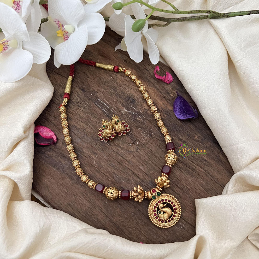 Elevate your style with our Gold Look Alike Beaded Peacock Pendant Mala. Featuring a stunning peacock pendant and maroon beads, this mala exudes luxury. Complete the look with the matching earrings for a sophisticated and exclusive touch. Perfect for any occasion, this mala is sure to turn heads.