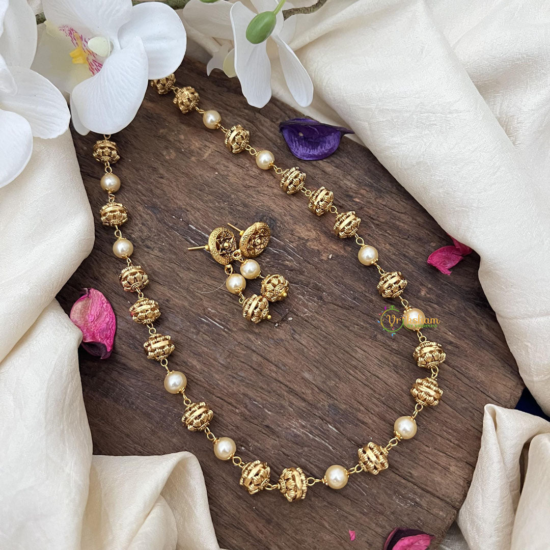 Indulge in the luxury of this exquisite Gold Look Alike Beaded with Pearl Mala. Each delicate bead is meticulously crafted to resemble real gold, adding a touch of opulence to any outfit. With the included matching earrings, this set is perfect for any occasion, making you feel truly special and elegant.