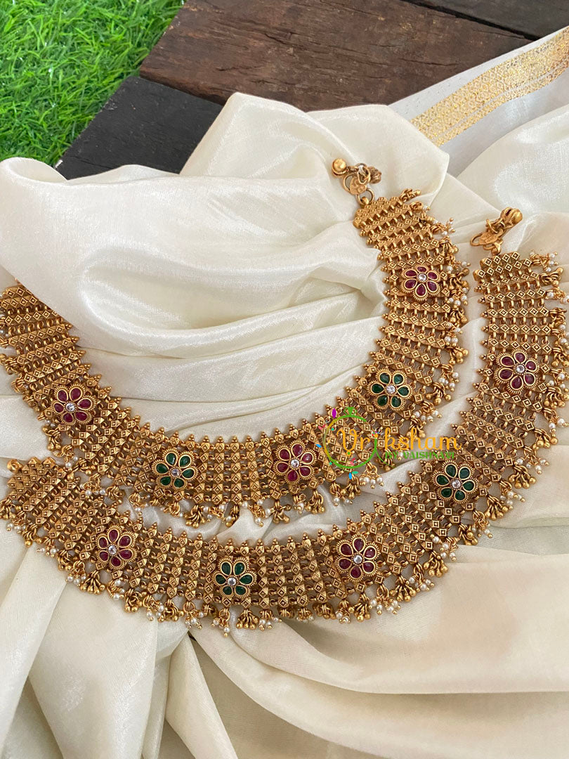 Gold Look Alike Bridal Anklets-Floral shaped pattern Red Green Stone anklets -layered broad anklets. Pearl and Ghungroo finish.