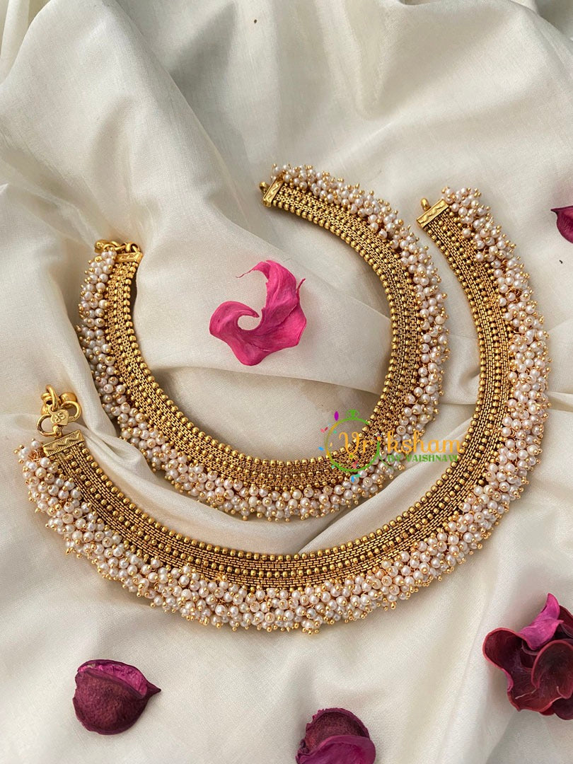 Gold Look Alike Bridal Anklets-Cluster Pearl layered NO STONE anklets -layered broad anklets.