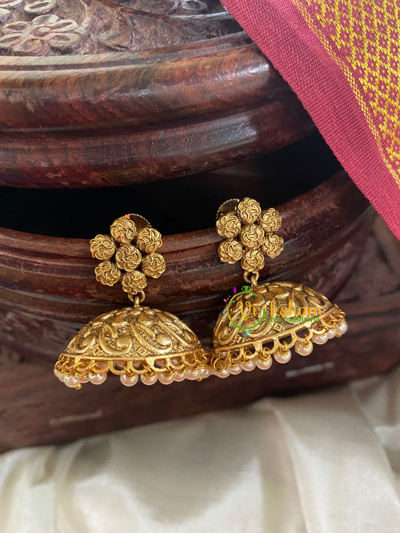 Premium Gold Look Alike Bridal Jhumkas – NO stone; Floral stud and fern pattern – Pearl finish