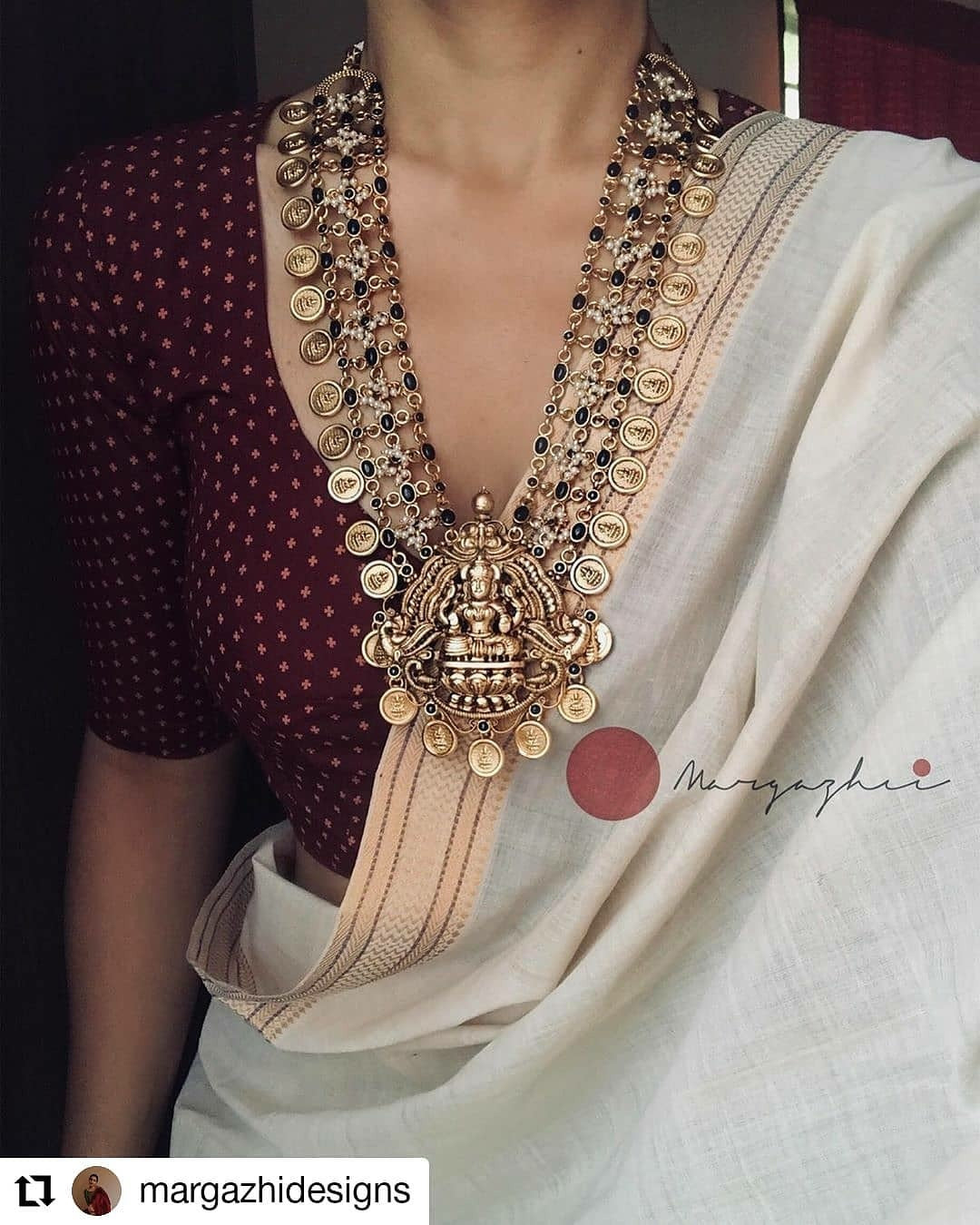 3 layer gold look alike coin haaram – Blue with earrings. The polish is look alike to Gold jewelry. The stud earrings that come along with it makes the entire ensemble grand, elegant and beautiful. The stones are premium quality Kemp. With minimalistic pearls on the jewelry the outlook is extremely gorgeous