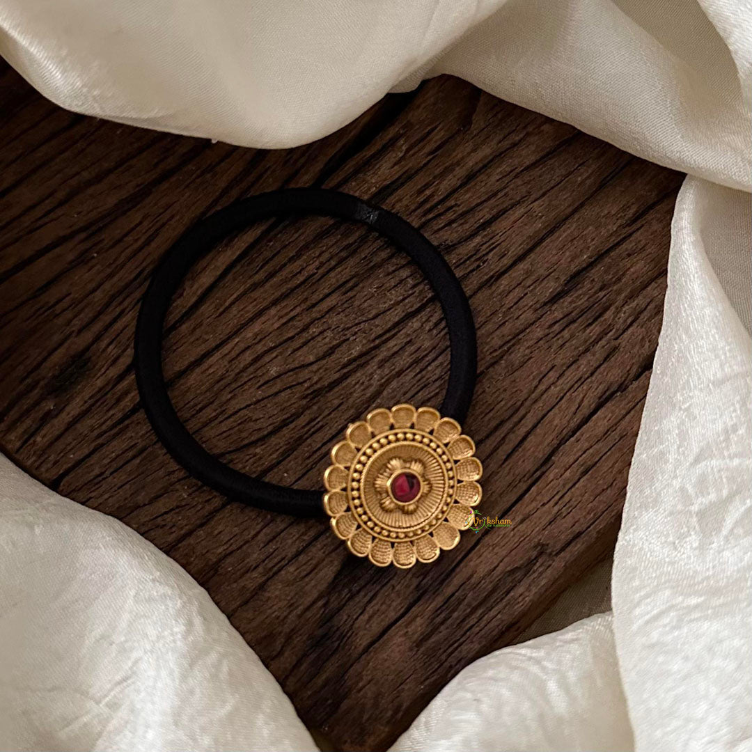 Add a touch of elegance to your hair with our Gold Look Alike Festive Rubber Band. Featuring a beautiful floral design and a precious red stone at the center, it's the perfect accessory for any occasion. Elevate your look effortlessly with this stunning piece.