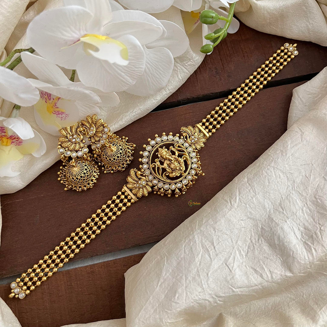 Introducing our exquisite Gold Look Alike Ganesha Choker, adorned with breathtaking golden pearls and vibrant white accents. Embodying luxury and sophistication, this piece combines opulence and spirituality for a truly unique and exclusive accessory. Elevate your style with this timeless masterpiece.