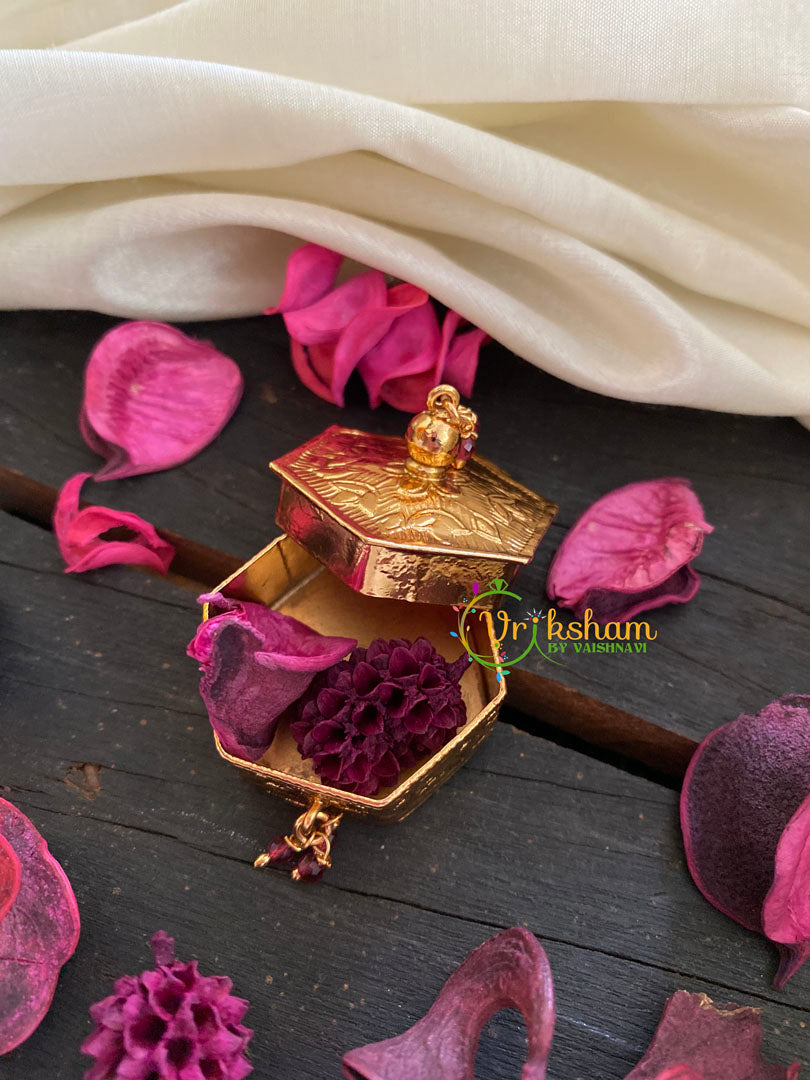 Gold Look Alike Hexagon Kumkum Box-Red Bead- No stone just hanging beads studded square shaped box.