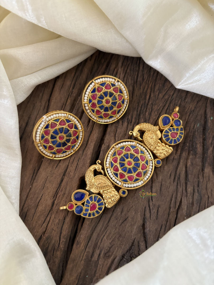 Gold Look Alike Jadau Kundan High Neck Choker - Neckpiece and Earrings - premium quality polish and semi precious stones - hand made by our artisans, boasts the design and quality of a real silver choker (but not silver) at an affordable price.