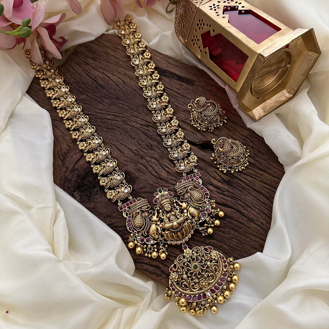 Indulge in the opulence of our Gold Look Alike Lakshmi Haram-Gold Bead necklace. Crafted with precision and intricacy, this stunning piece exudes luxury and elegance. The gold look alike design, coupled with the beautiful Lakshmi pendant, will make you feel like a goddess. Elevate your style with this exclusive piece.