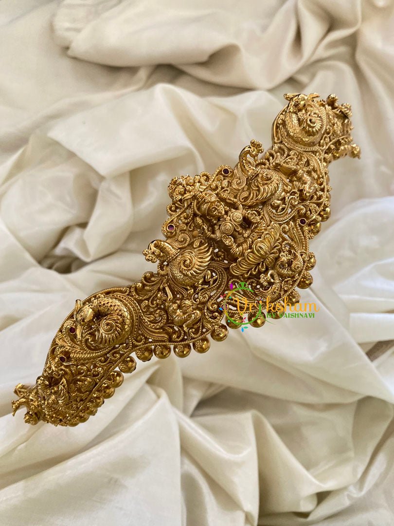 Gold look alike Lakshmi hip belt -Centre Lakshmi piece & peacock along the sides with red and green CZ stones.