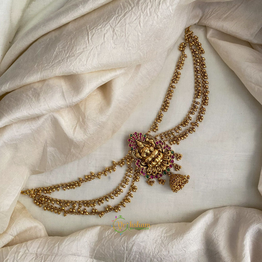 Gold Look Alike Lakshmi Jada Bun Billai Maatil - Ghungroo Maatil - Jhumka - Bridal Hair accessory.The Gold Look Alike Lakshmi Jada Bun Billai Maatil is a mesmerizing hair accessory that embodies traditional elegance and spiritual symbolism. As it motifs, symbolizing strength, wisdom, and auspiciousness in Indian culture.