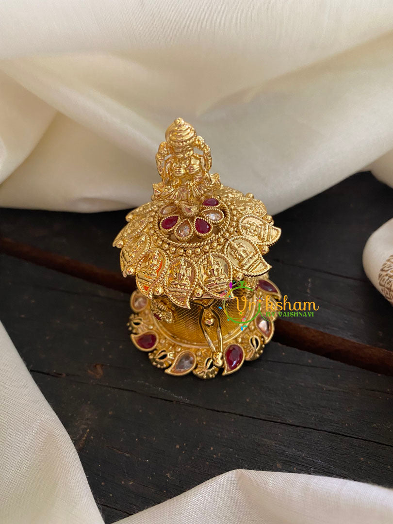 Gold Look Alike Lakshmi Kumkum Box – Petals- Red White shaped red stone studded top lakshmi idol on a round shape boxed .