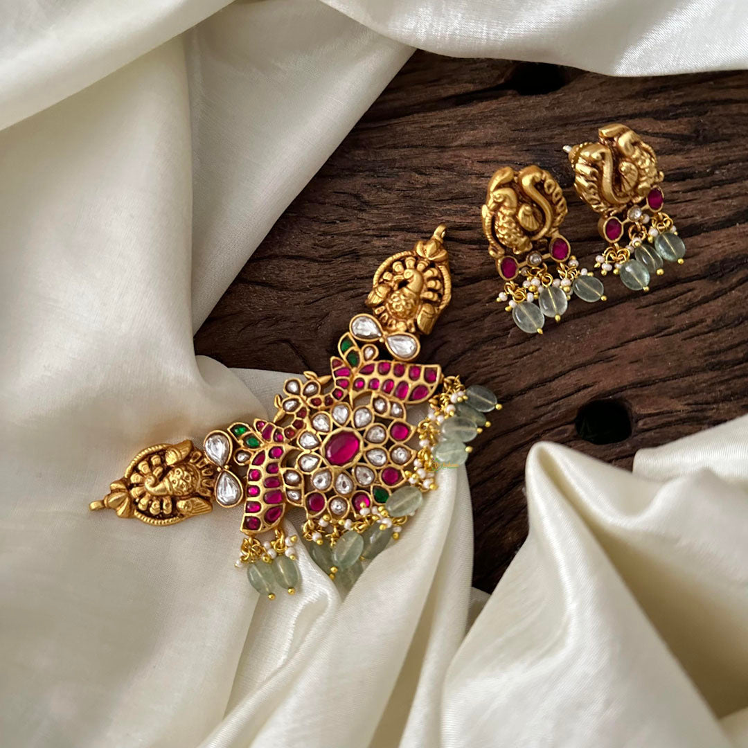 Add an elegant touch to your traditional outfit with our Gold Look Alike Mayil Kundan Jadau Choker. The choker features a beautiful mayil design with flower detailing and is studded with red, green, and white kundan stones. The finishing touch of aqua green beads adds a pop of color. Elevate your style with this stunning piece. Comes with matching earrings.