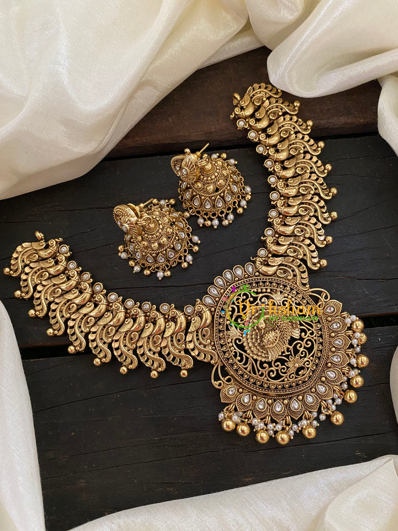 Premium Gold Look Alike Peacock Neckpiece -Ghungroo-Red green kemp neckpiece with matching earrings; CLUSTER PEARL FINISH.