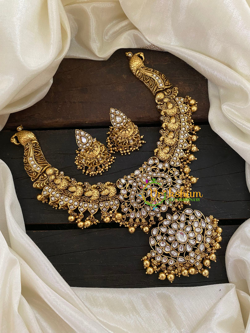 Premium Gold Look Alike Peacock Neckpiece -Ghungroo-White Stone neckpiece with matching earrings.