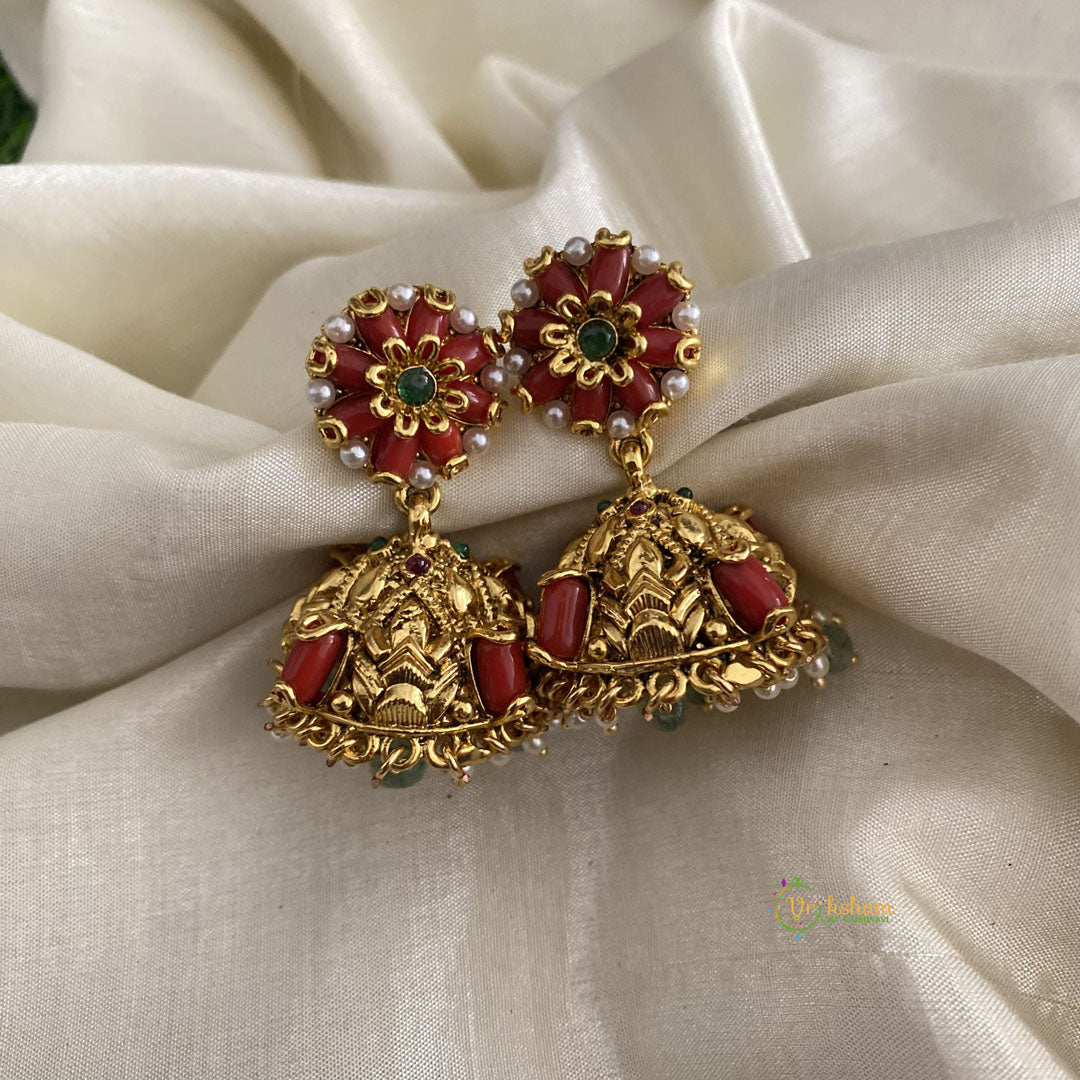 Gold Look Alike Red Flower Jhumkas-White Pearls-Green Beads - The Gold Look Alike Red Flower Jhumkas white pearls and green beads embody elegance and tradition in every detail. Perfect for both formal occasions and everyday wear, these jhumkas evoke the grandeur of Victorian era temples, making them a statement piece for those who appreciate refined classic beauty.