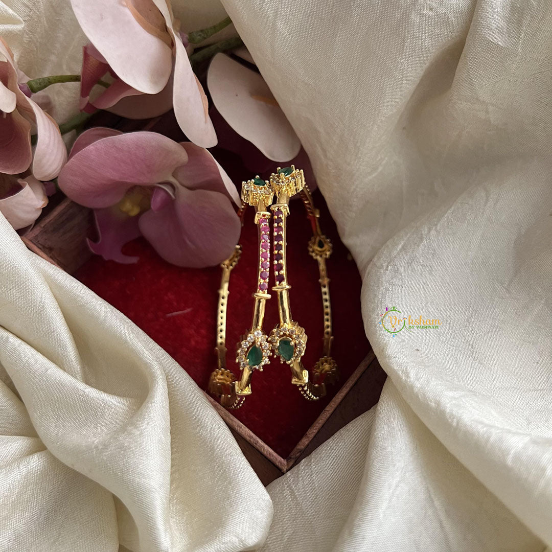 Gold Look Alike Red Green AD Stone Bangle Set-Tilak- AD Stone studded festive bangles , Comes as pair only.