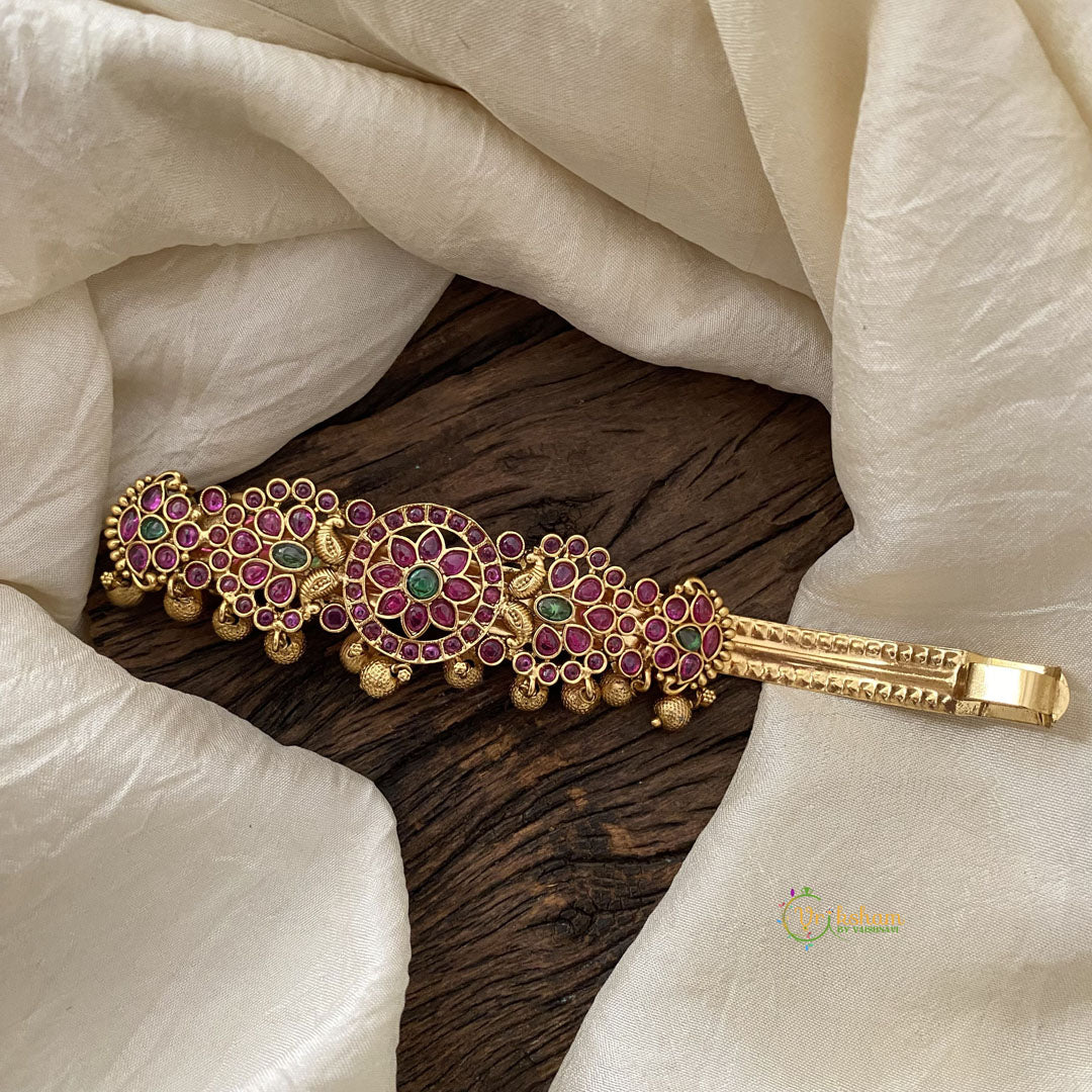 Gold Look Alike Red Green Floral Hairclip - Gold Look Alike hair clip for festive braids and hairstyling, with gold bead finish.
