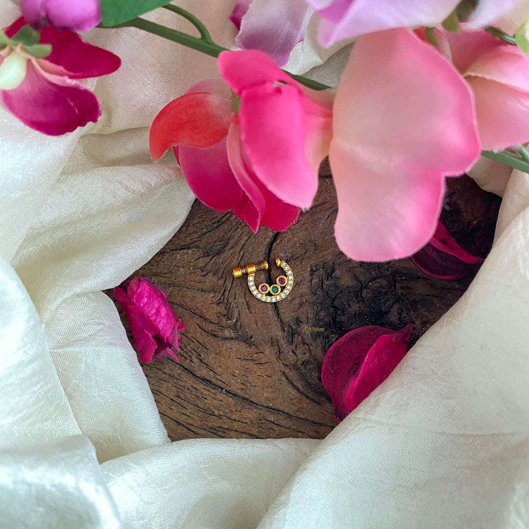 Indulge in luxury with our AD Stone Nath / Nose pin. Featuring a simple gold look and sparkling AD stones, this nath will elevate your style and add a touch of elegance to any outfit. Perfect for special occasions or daily wear, our nath offers a premium quality without the high price tag. Elevate your look today.