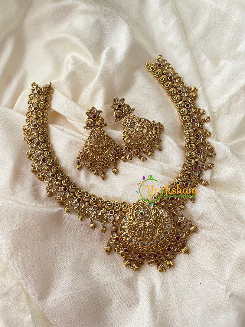 Gold Look Alike Short Neckpiece -floral -Gold Bead with red green white ad stone pendant and shaped gold bead finish.