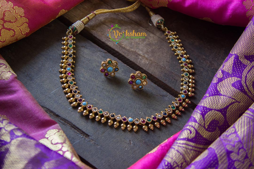 Gold look alike simple choker - Navratna with stud earrings