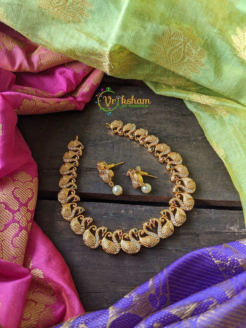 Gold Look Alike Swan Short Neckpiece - AD white stone set with red and green stone eyed swan arranged in linear fashion as length of the neckpiece. Comes with swan ear studs and pearl drops.