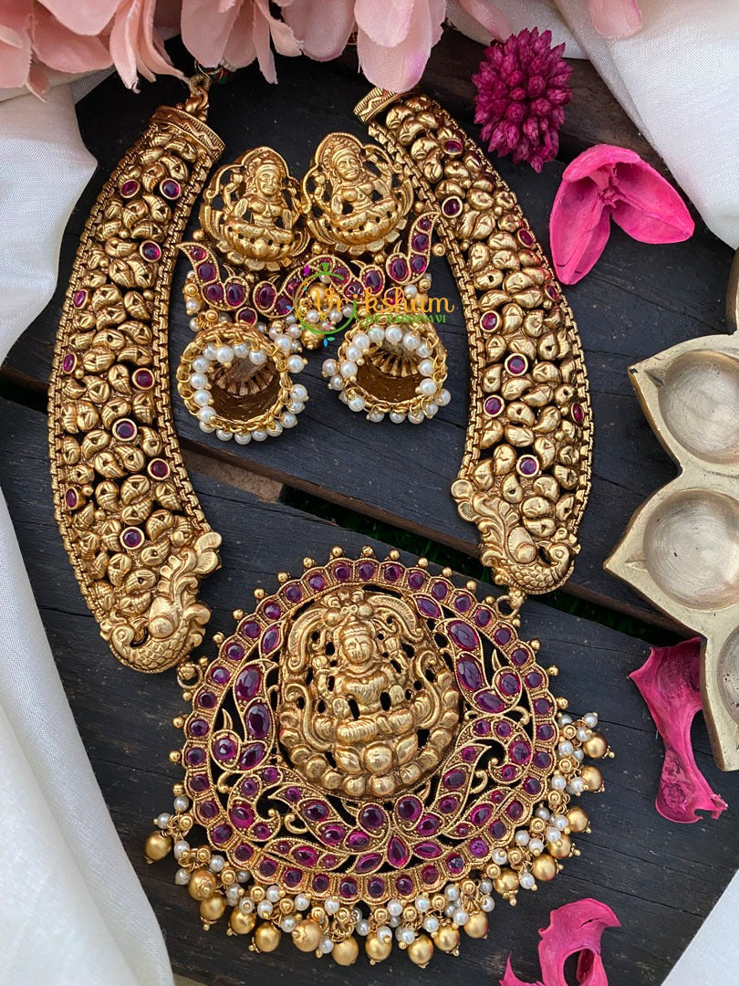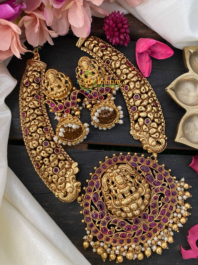 Premium Gold Look Alike Temple Choker with Lakshmi pendant -Red kemp neckpiece with matching earrings; GOLD BEAD and PEARL FINISH; comes with matching jhumkas.