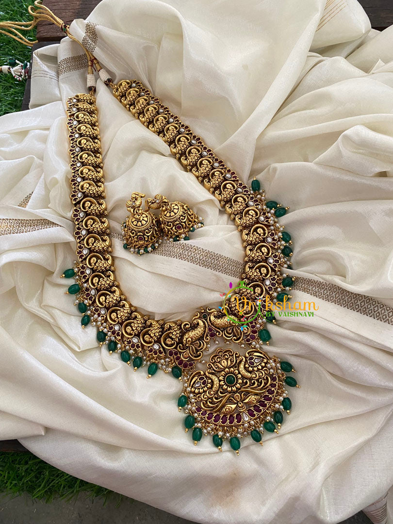 Premium Gold Look Alike Temple Haram-Green Bead Finish-premium quality polish and semi precious stones peacock pattern and comes with matching earrings.