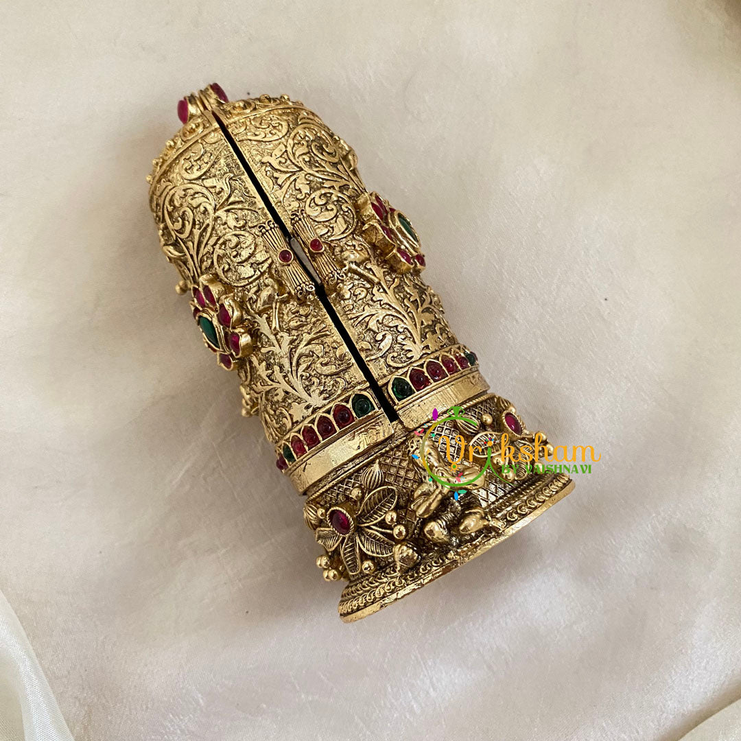 Gold Look Alike Temple Kumkum Box - Red Green AD stone studded and engraved antique look polish kumkum box.