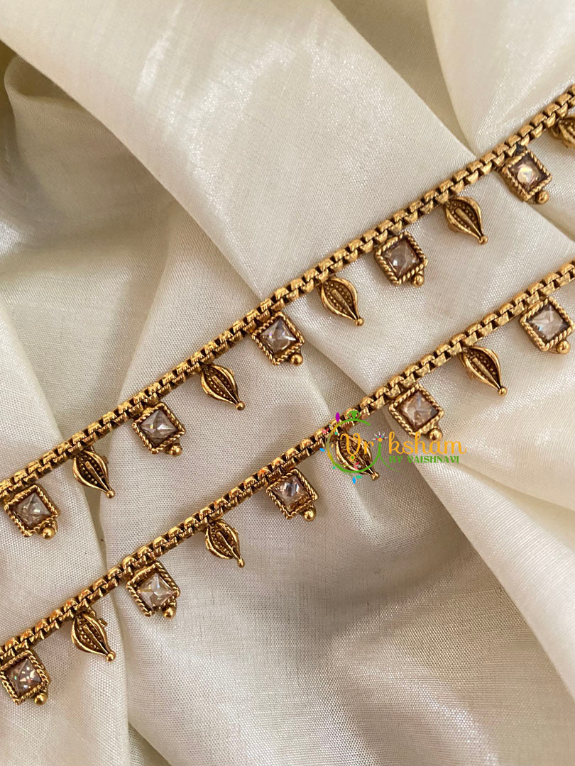 Elegant Gold Look Alike Thin Anklets-Square and Leaf-White non precious stone studded anklets -single strand anklets.