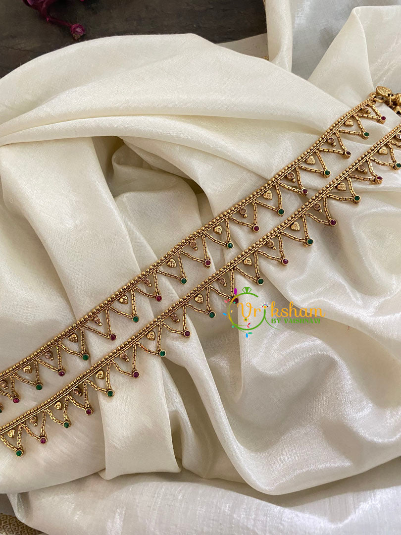 Elegant Gold Look Alike Thin Anklets- V Chain layer with Red Green non precious stone studded anklets -single strand anklets.