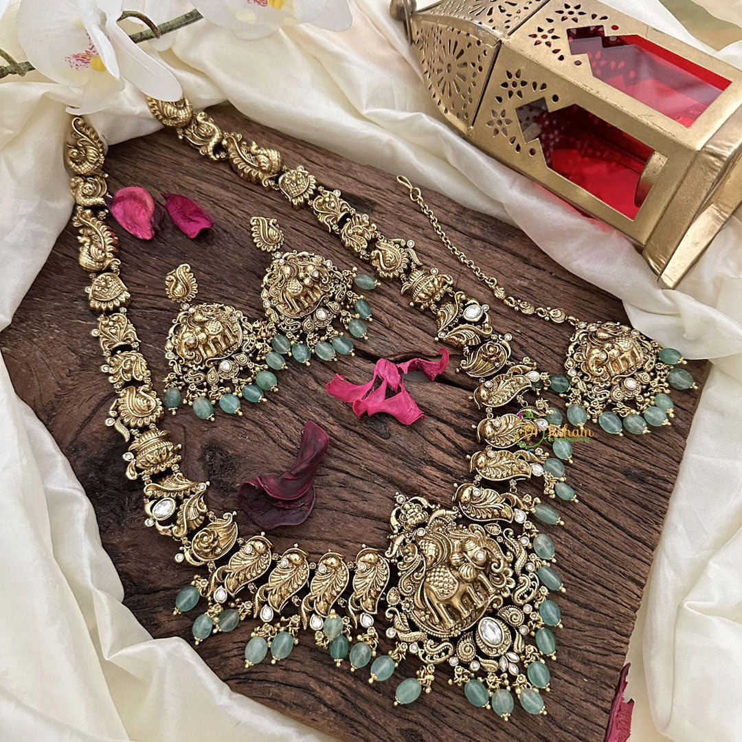 Elevate your jewelry collection with our Gold Polish Long Elephant Haram. Adorned with white ad stone, aqua green beads, and pearls, this statement piece will add a touch of luxury to any outfit. Make a bold and stylish statement with this exquisite necklace.