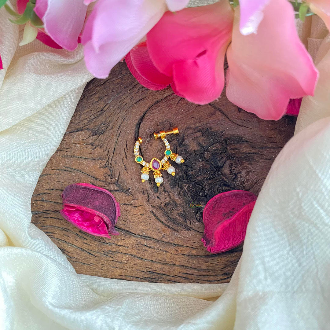 Gold Polish Red Green AD Stone Nath / Nose pin-Pearl-G13762