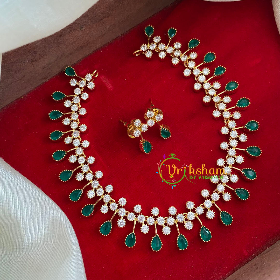 Premium Gold Tone American Diamond Choker-Green Tear drops-White and Green AD stone studded american diamond jewelry with full white stone , ear danglers.
