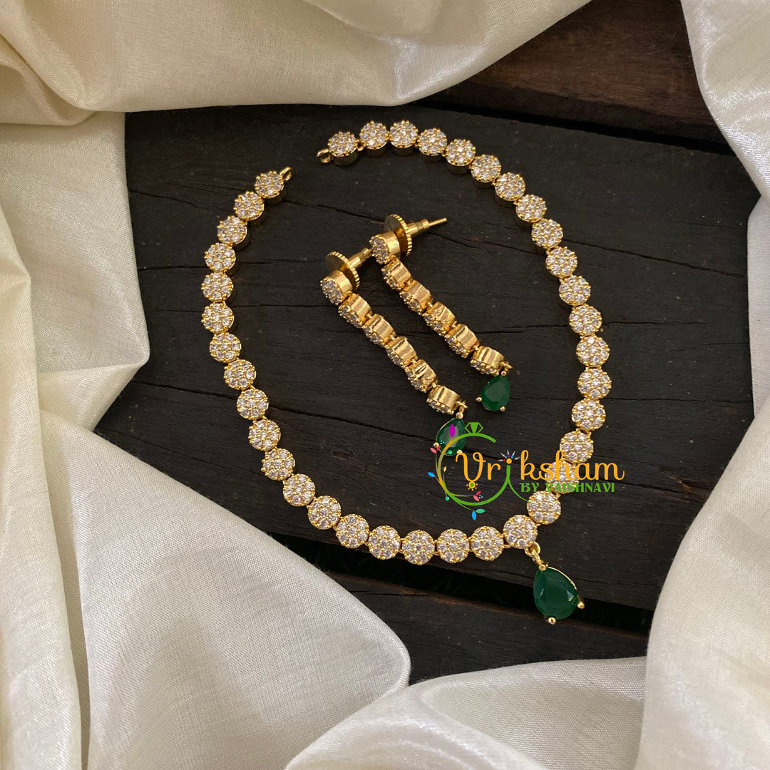 Gold Tone American Diamond Choker Short Neckpiece-Green Pendant- GREEN AD stone studded jewelry -set of neckpeice and earrings.