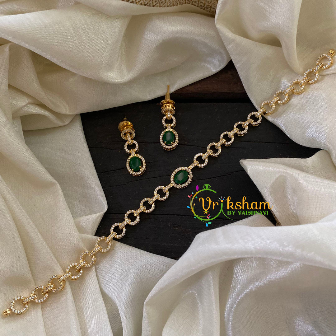 Gold Tone American Diamond Choker Short Neckpiece-Green centre Pendant- GREEN AD stone studded jewelry -set of neckpeice and earrings.