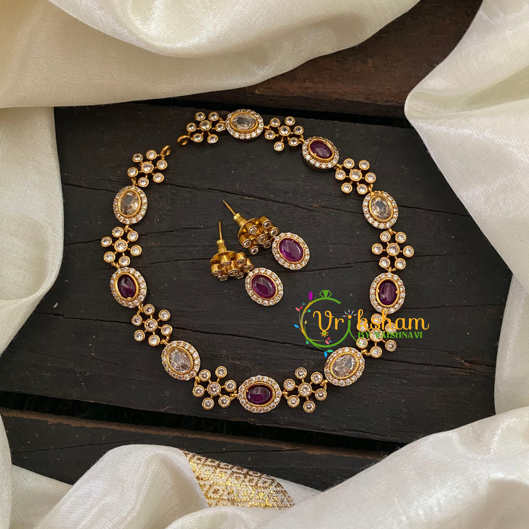 Gold Tone American Diamond Choker Short Neckpiece-Pink - NO Pendant-AD stone studded jewelry -set of choker and earrings