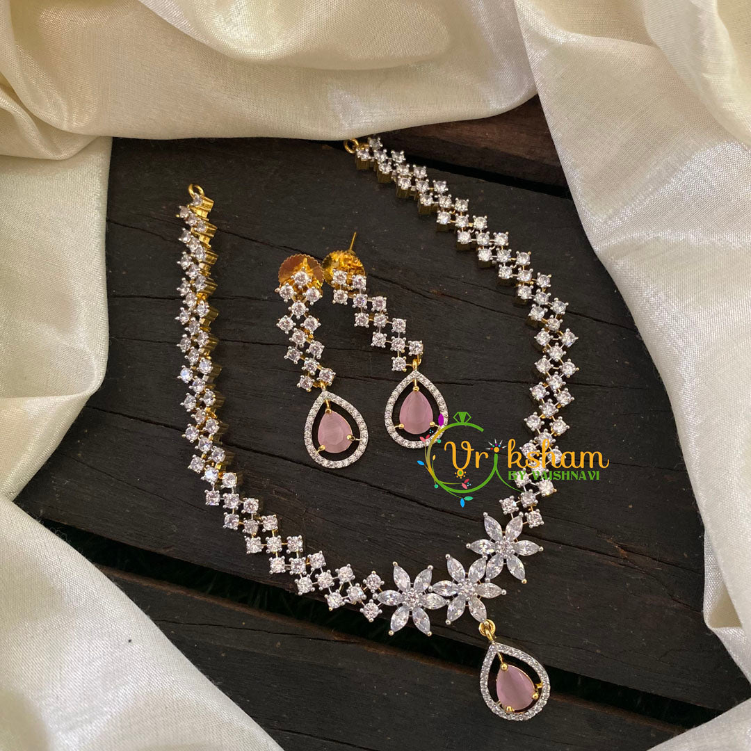 Gold Tone American Diamond Choker Short Neckpiece-Pastel Pink Pendant-AD stone studded jewelry -set of choker and earrings