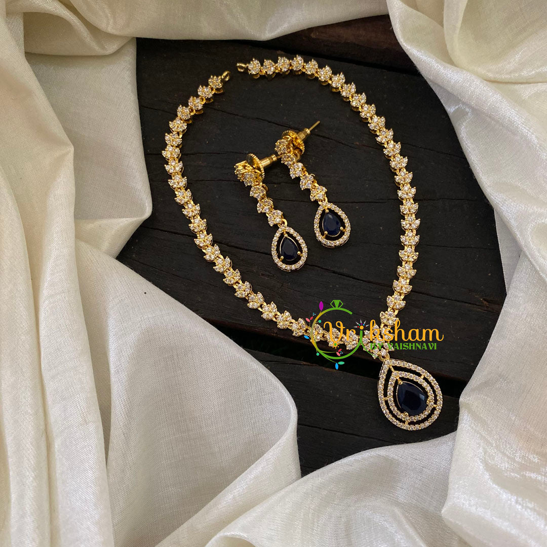 Gold Tone American Diamond Choker Short Neckpiece-Blue Pendant- Blue AD stone studded jewelry -set of neckpeice and earrings.