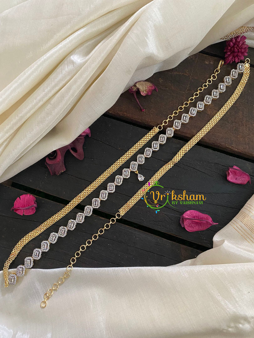 Gold Tone American Diamond Hip Chain- Bridal Hipbelt-Dice Links with a tear drop pendant-White stone pattern –gold tone hip chain with adjustable back chain.