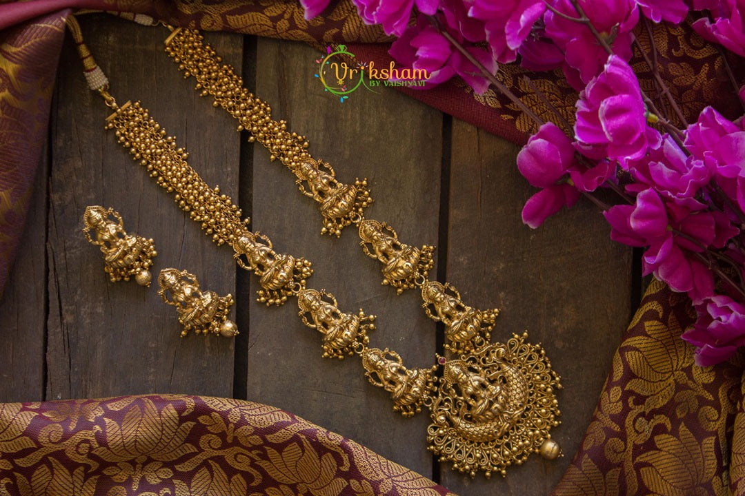 Gold Look Alike Premium Quality Golden Beads Lakshmi Haaram with earrings and back rope