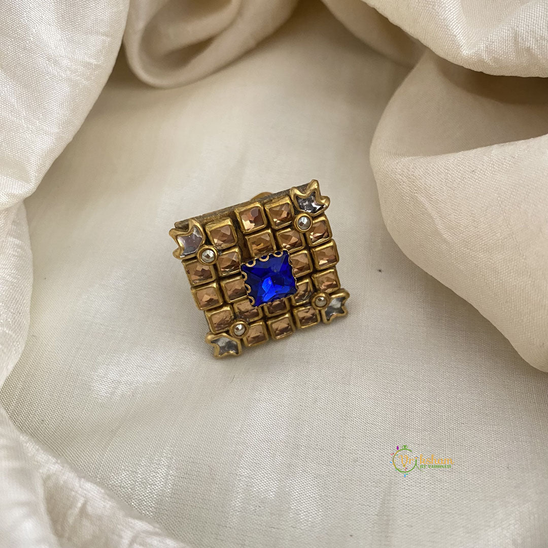 Golden, Blue Square Kundan Pendant Ring-Diamond- semi precious stone - Festive Wear Hair bands-premium gold like polish pendant.